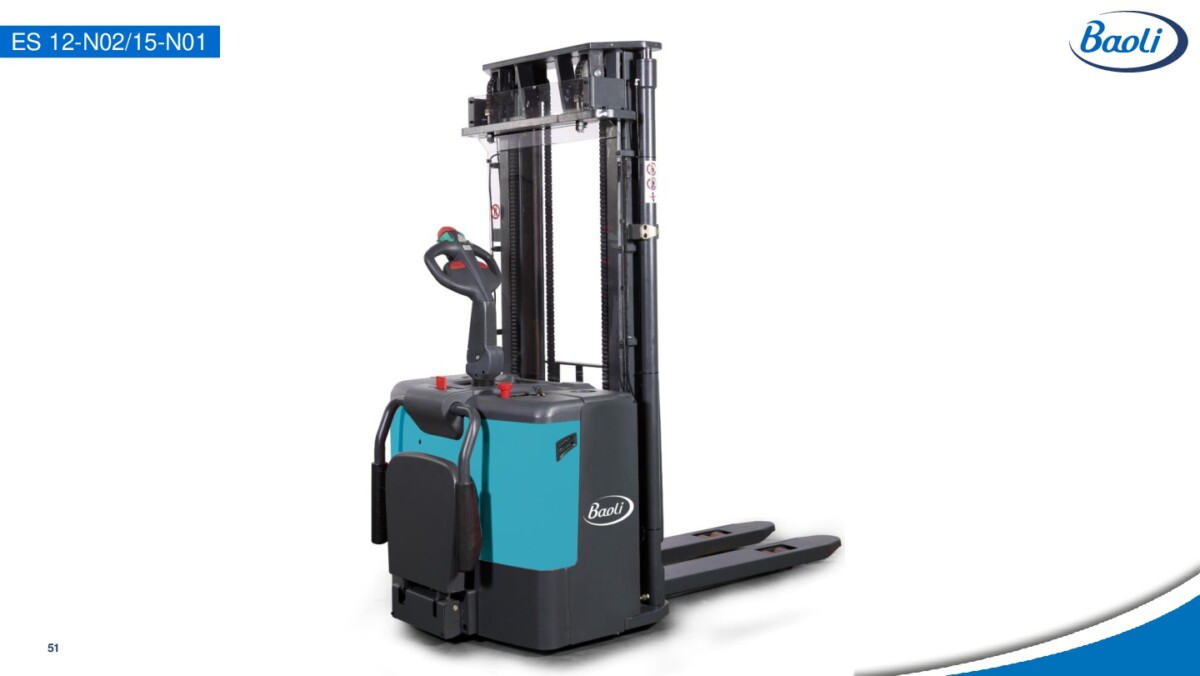 - Las apiladoras ES 12-N02 y ES 15-N01 de Baoli están diseñadas para los trabajos de intensidad media a pesada, y tienen una capacidad de carga de 1200 kg y 1500 kg.