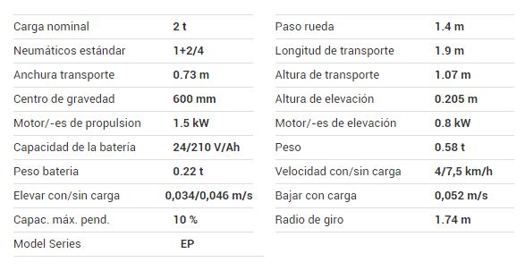 - Con una velocidad máxima de 12 km/h sin carga y de 9 km/h con carga, la EP 20-111 ofrece grandes ventajas en comparación con las transpaletas de conductor acompañante.
